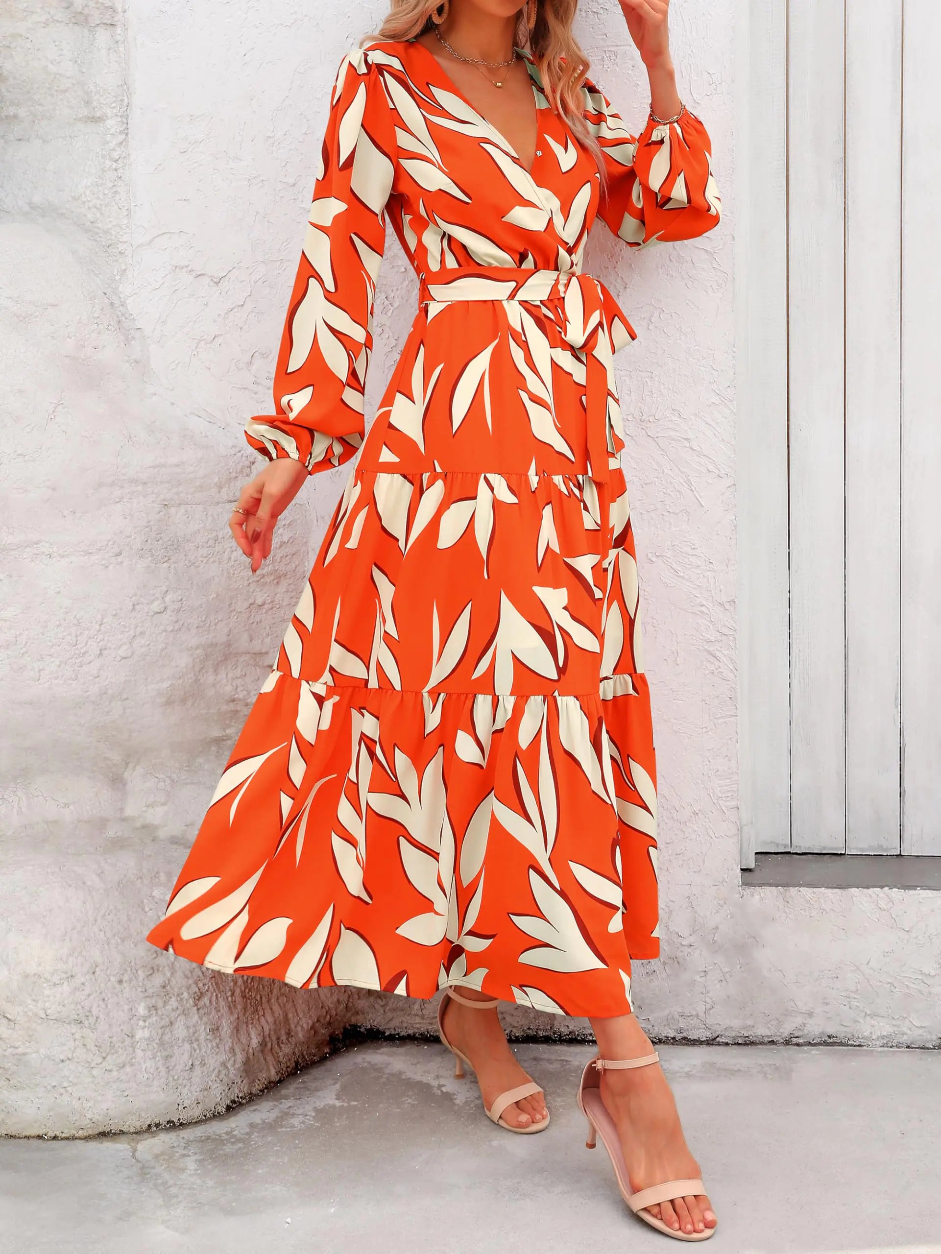 PRETTYGARDEN Womens Fall Long Sleeve Wrap V Neck Ruffle Floral Maxi Dress Casual Tie Waist Boho Chiffon Flowy Long Dresses XX-Large F-orange White - # GIAA231710002