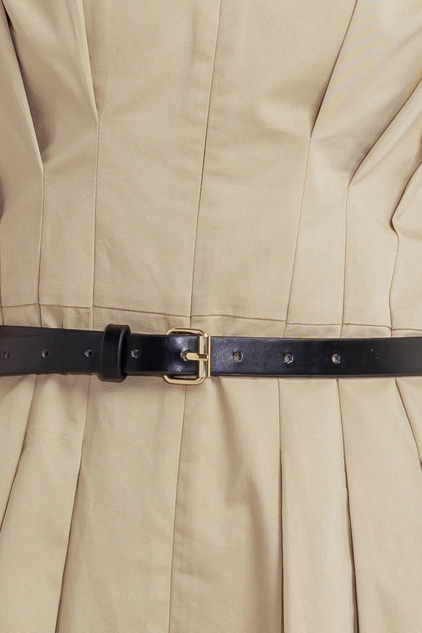 A solid woven midi dress featuring collar, short sleeve, front zipper closure, contrasting belt and full skirt