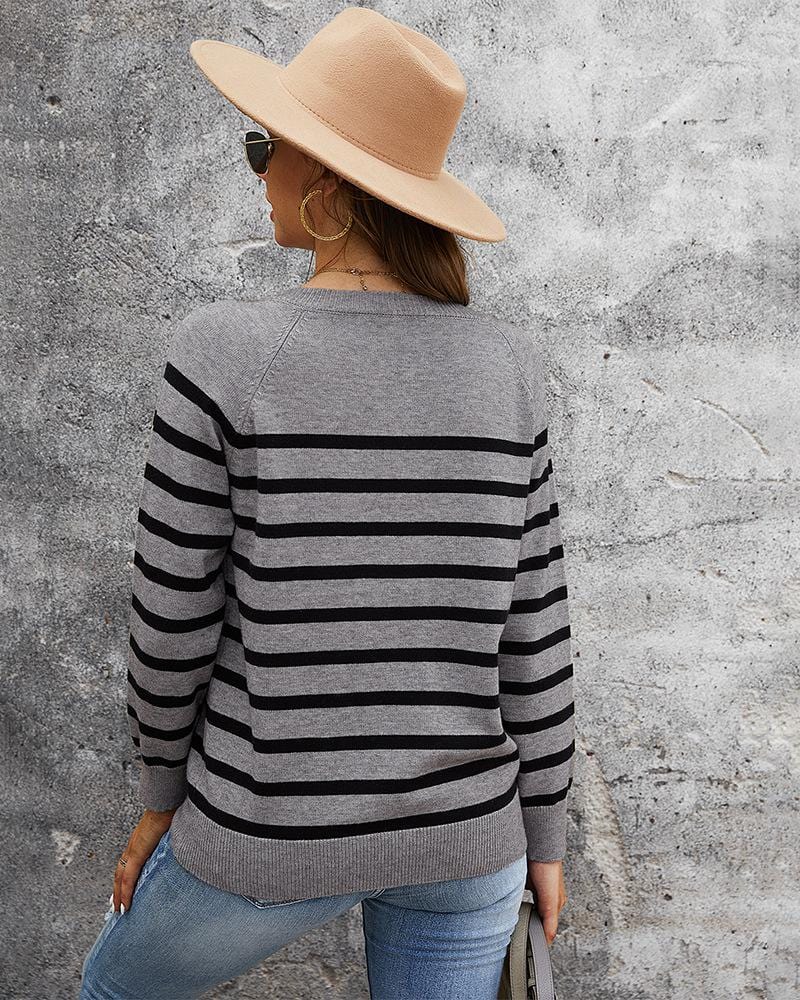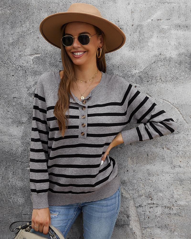 Round Neck Button Striped Sweater