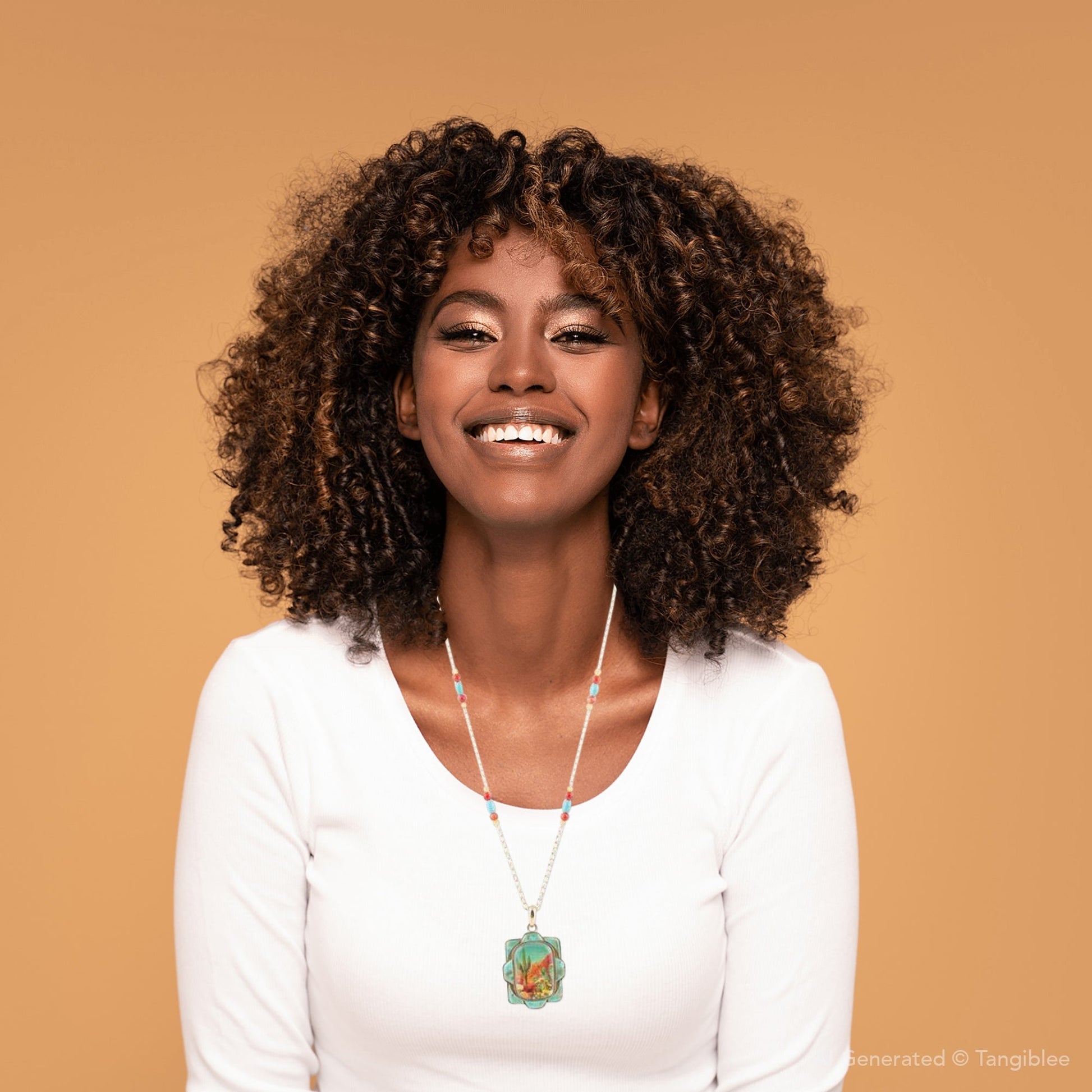 Experience the breathtaking beauty of the Scenic Sedona Desert with our Desert Blue Turquoise Golden Pendant Necklace. This stunning piece features a genuine turquoise stone pendant surrounded by a vibrant desert picture under a clear quartz overlay. The adjustable necklace can be worn up to 30" with a secure lobster clasp closure. Admire the 2.25" length from the bale and 1.5" width at its widest point. The necklace weighs 1.12 oz and is expertly crafted and finished by hand. Treat yourself to this truly remarkable and one-of-a-kind piece.