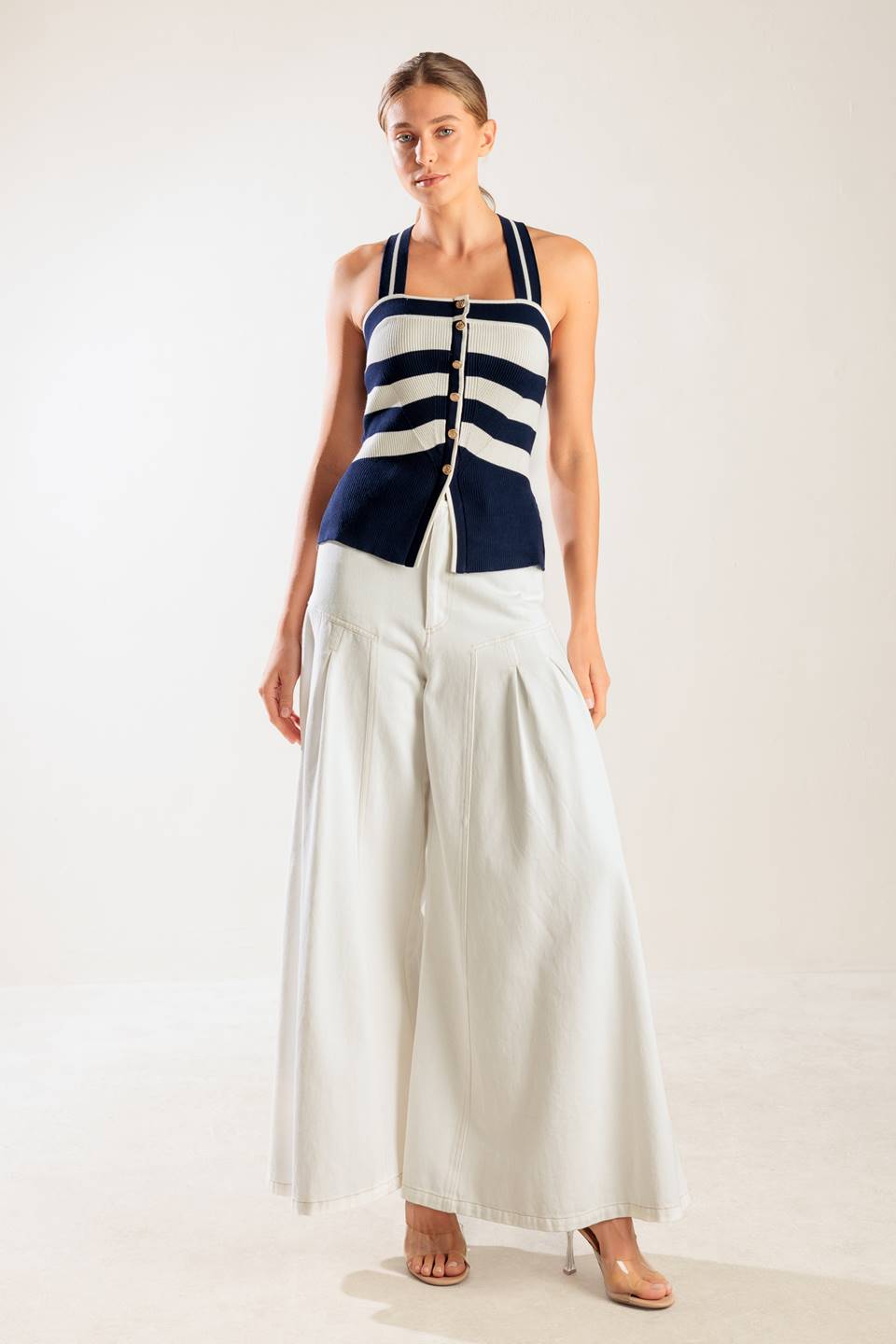 A navy and white striped sweater knit top featuring a halter neckline button down closure and cross back strap.
