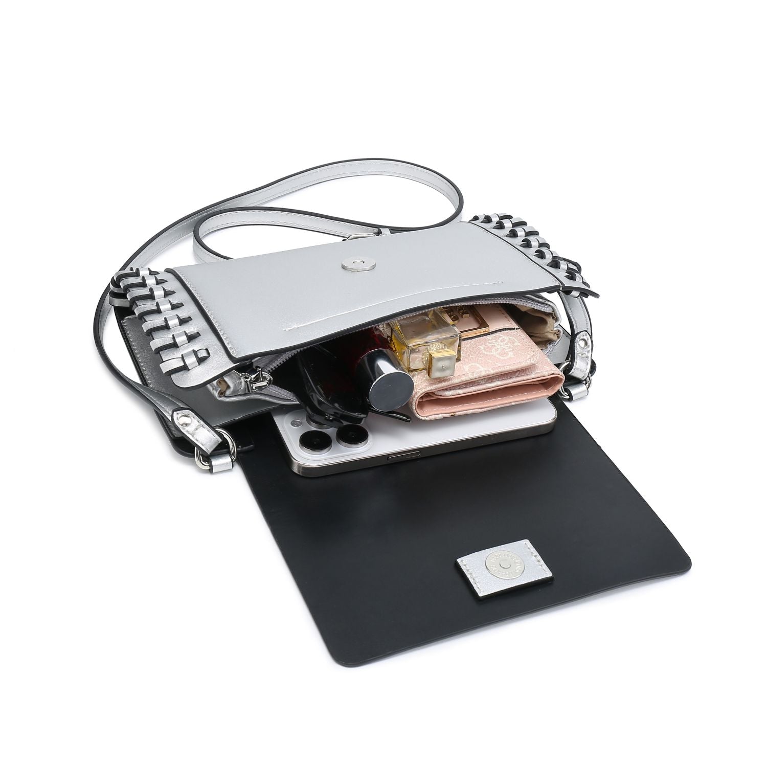 Silver Small Crossbody Bag Tan Compact Black Square Purse With Handcrafted Weave detail