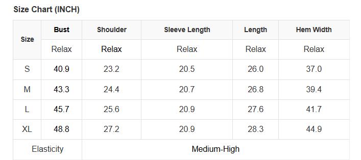 See size chart for approximate measurements.