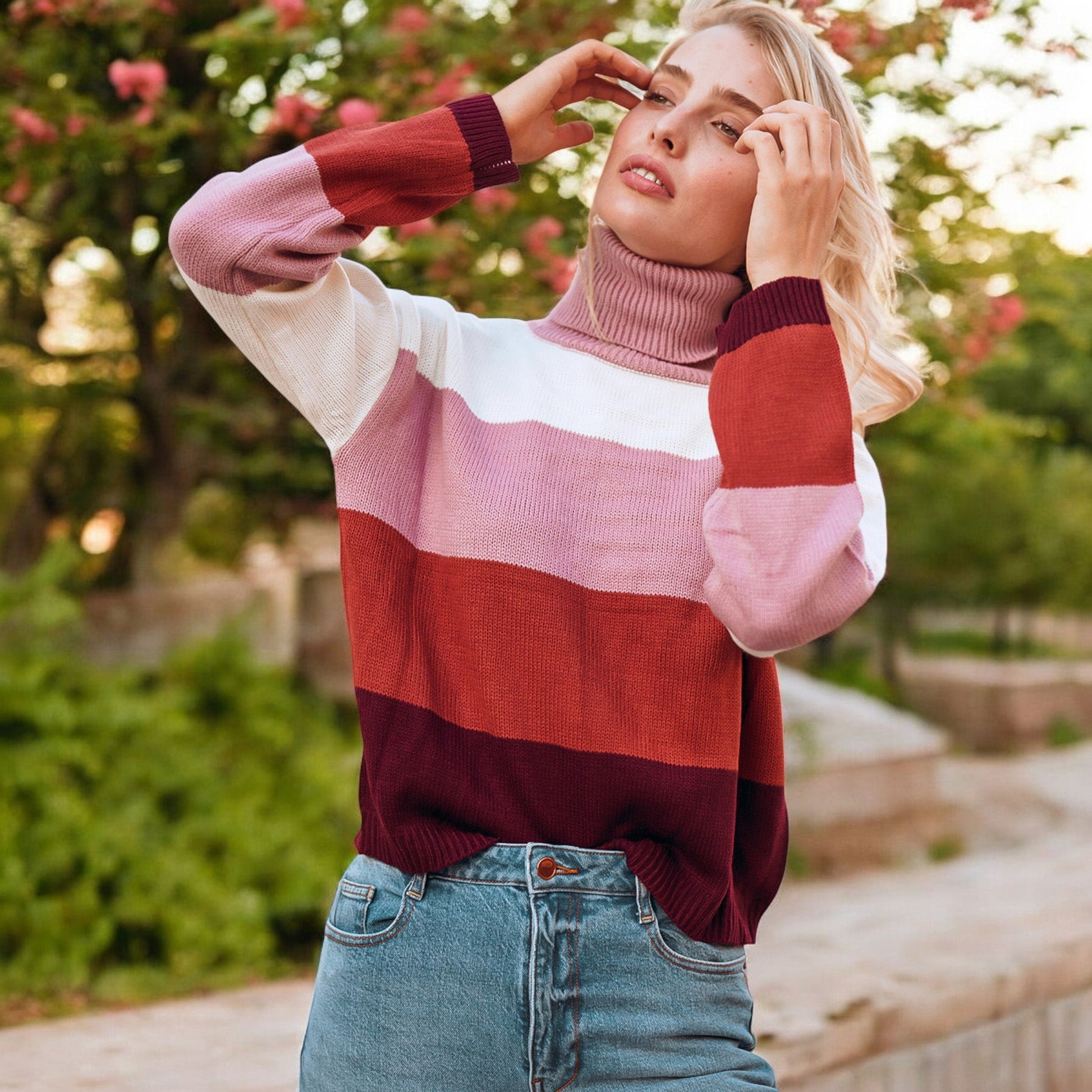 Striped Turtleneck Knit Pullover Sweater with Long Sleeves