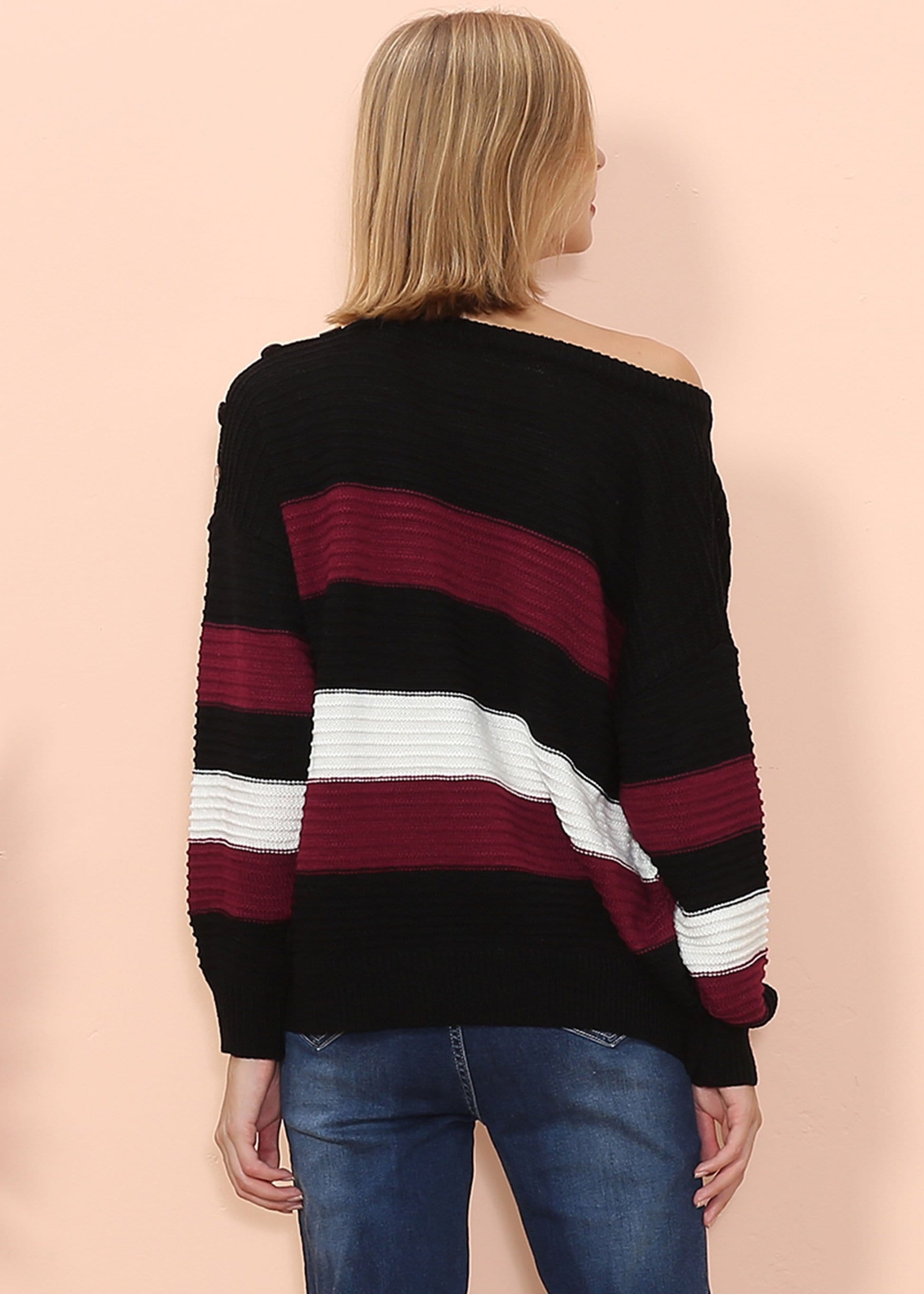 The Anna-Kaci sweater is detailed with a gorgeous textured knit material and triple colored striped design. Features a round neck line, long sleeves, button shoulder detail, and loose fit. Style it with a black hat and black denim jeans for a fierce look.