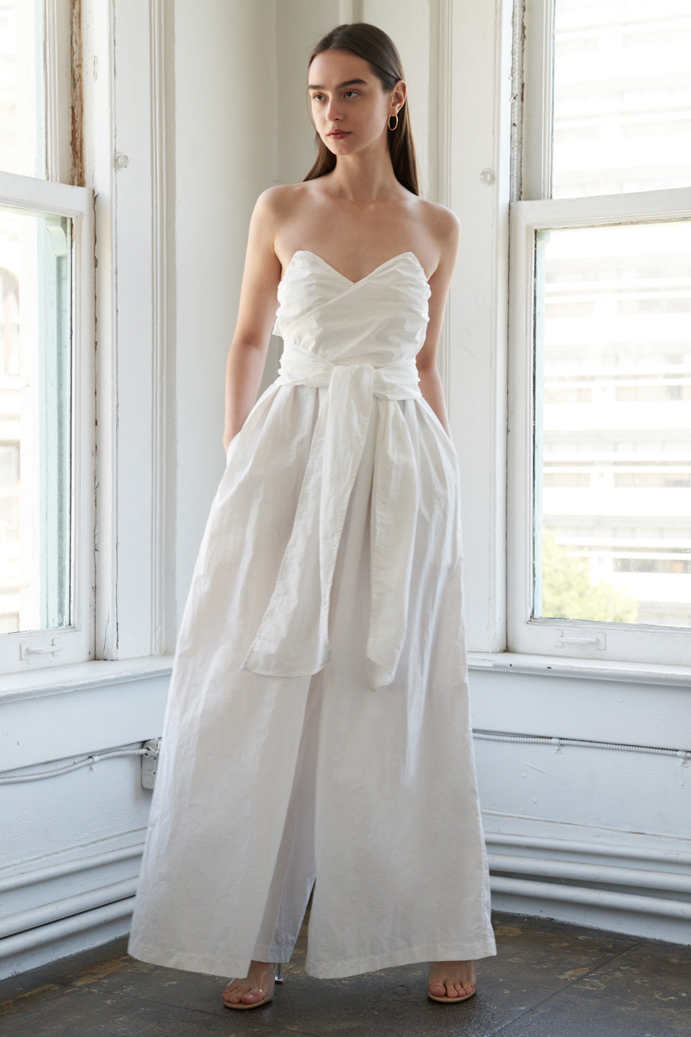 A solid woven jumpsuit featuring sweetheart neckline, wide leg, smocked back bodice and big bow tie detail