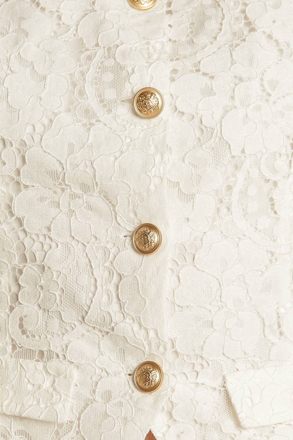 A white sleeveless woven lace vest featuring round neckline and button down.