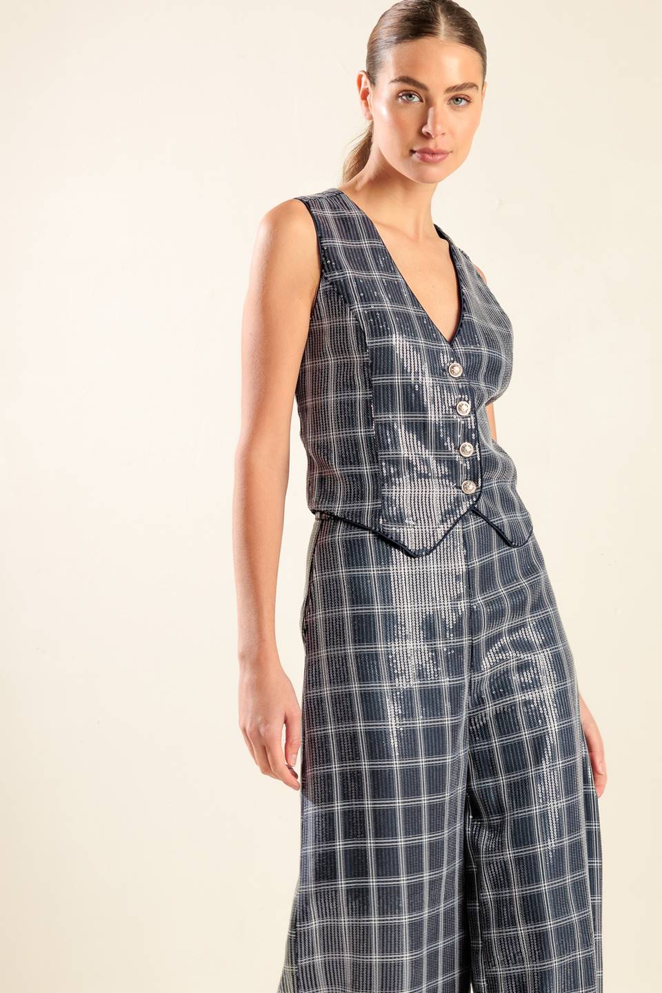 A sequin pant featuring front closure, side pocket and wide leg. Matching vest