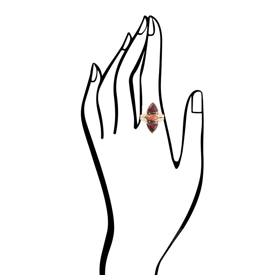 Discover the exquisite Tri-Stone Bordeaux Quartz Ring featuring genuine bordeaux quartz, orange sponge coral, and bronze metal. Each piece is meticulously crafted by hand, showcasing natural stones measuring 1" in length. Elevate your style with this unique statement piece that perfectly balances elegance and artisanal craftsmanship.