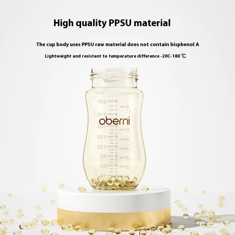 The bottle's design incorporates an arc shape, enhancing its aesthetic appeal while ensuring functionality. The feeding bottle has a wide caliber of 5 cm, making it easy to fill and clean. Crafted from high-quality PPSU for the bottle body and liquid silicone for the nipple, this set prioritizes safety and durability.