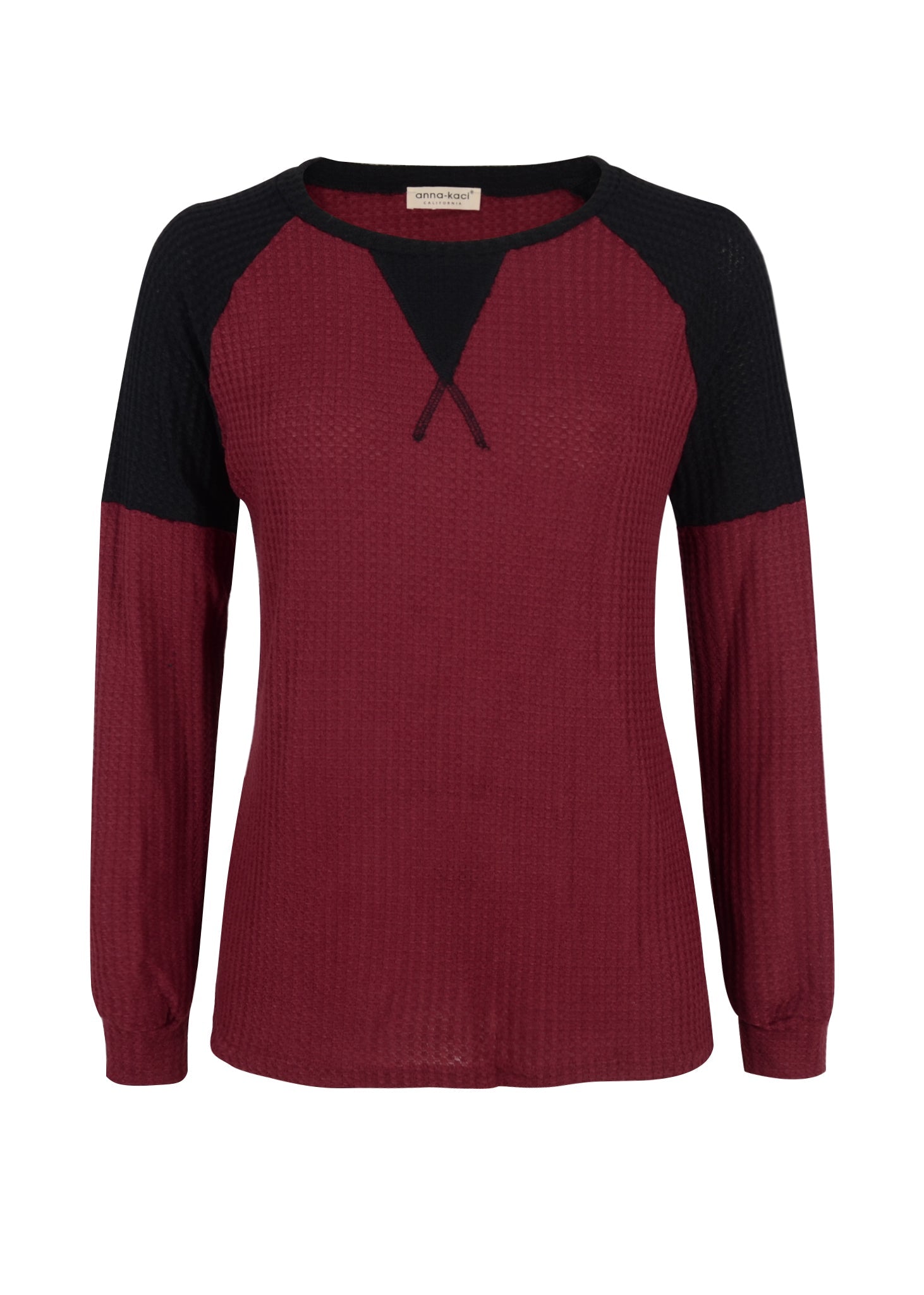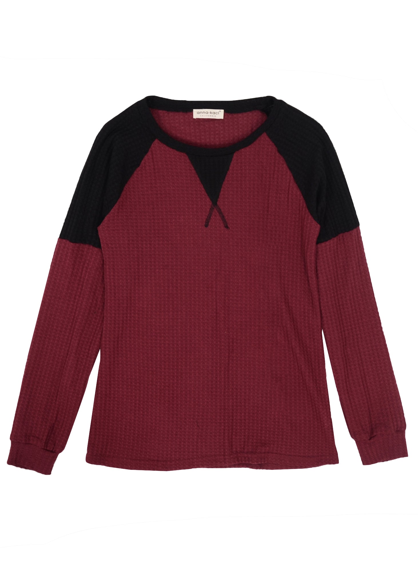 The Anna-Kaci waffle knit sweater is detailed with a fun two tone design on the shoulders and neck line. Features a round neck, long sleeves, and a loose fit. Layer it over a tank top and denim jeans for a casual fall look.