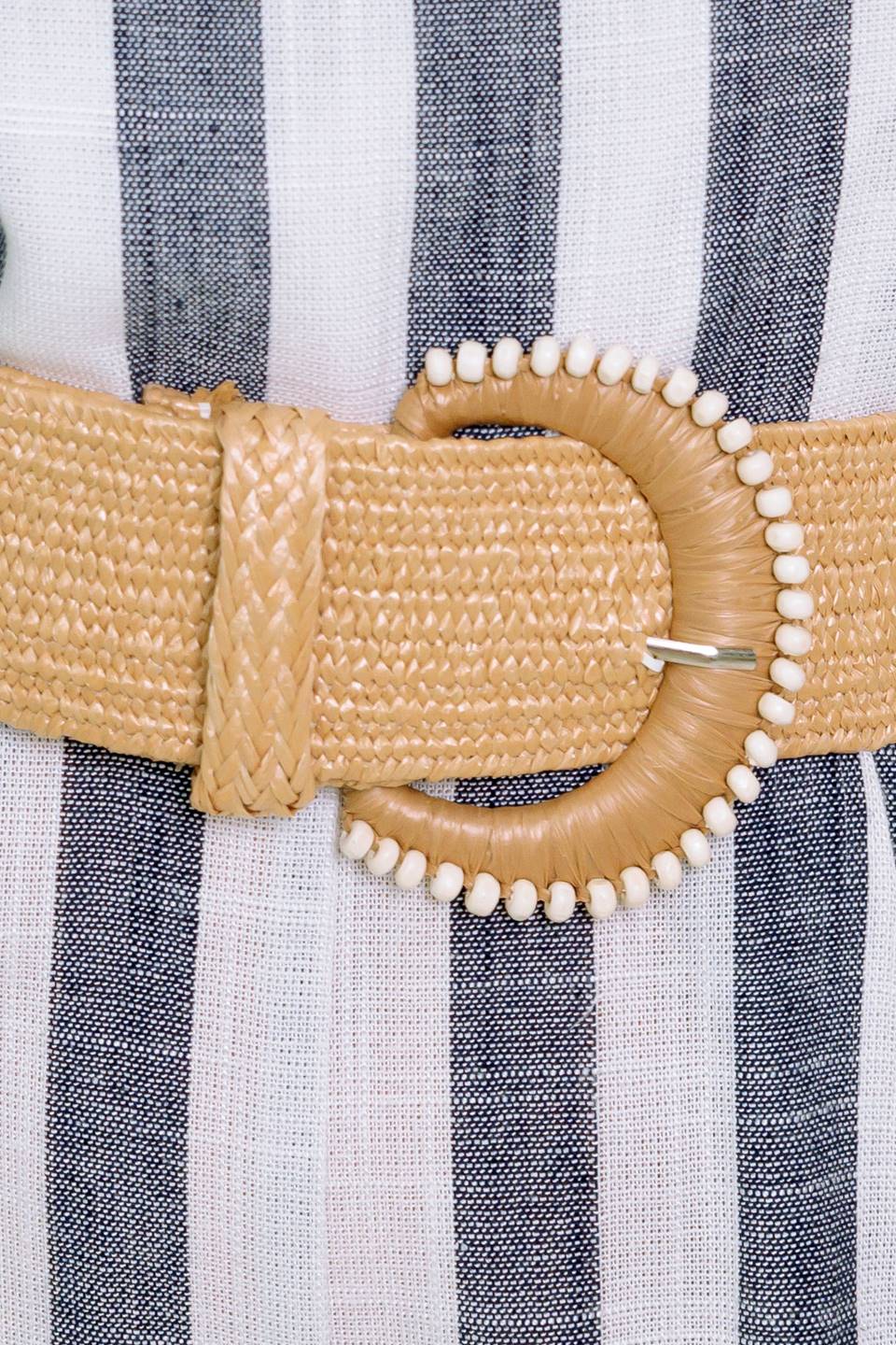 A strapless, striped woven jumpsuit featuring flounce, belt, side pockets and wide leg.