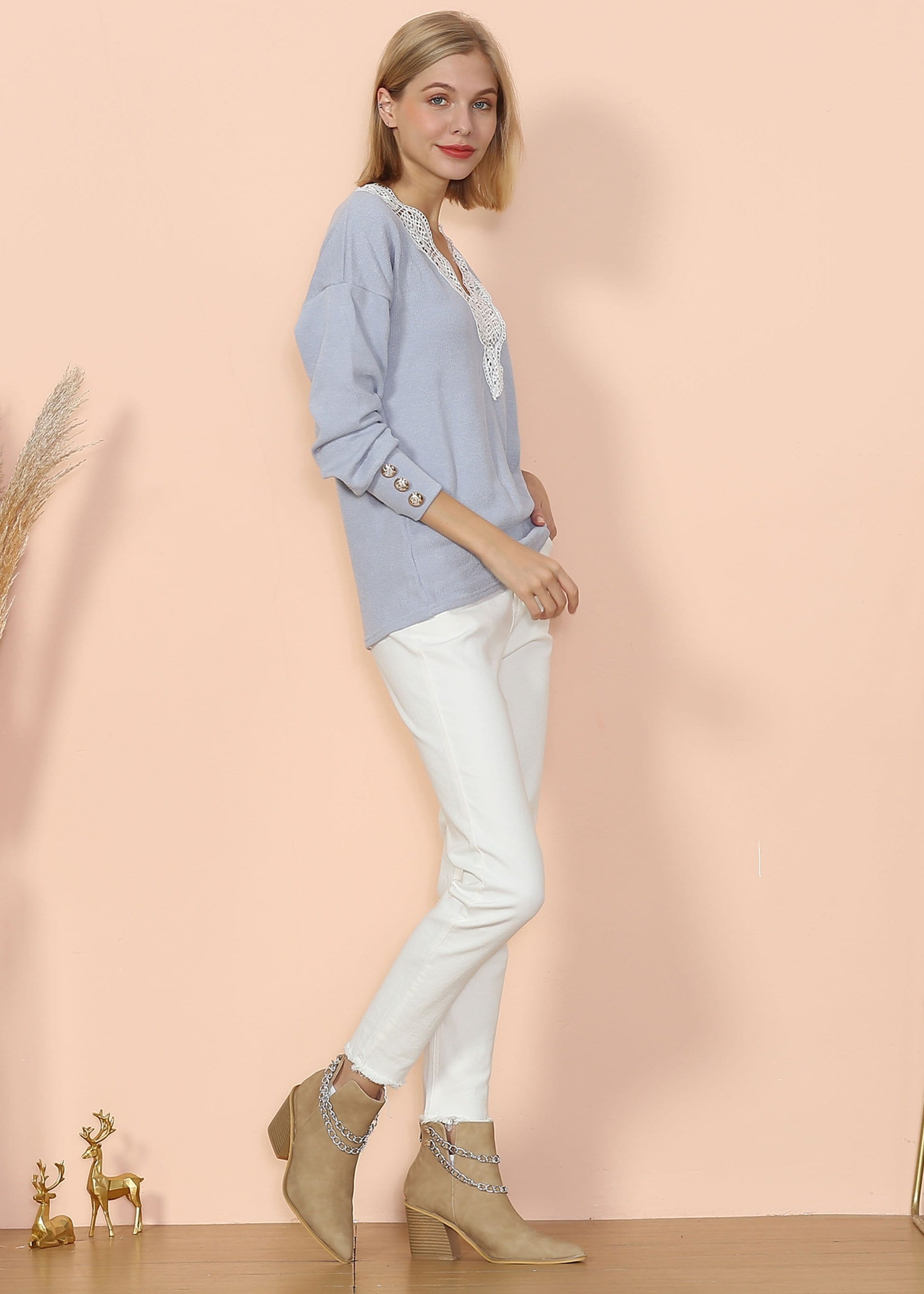 ??he Anna-Kaci sweater is detailed with dainty lace trim on the gorgeous v neck line. Features golden buttoned cuffs on the long sleeve hem, ribbed knit material, and a relaxed fit. Style it with distressed denim jeans to create a juxtaposing chic look.