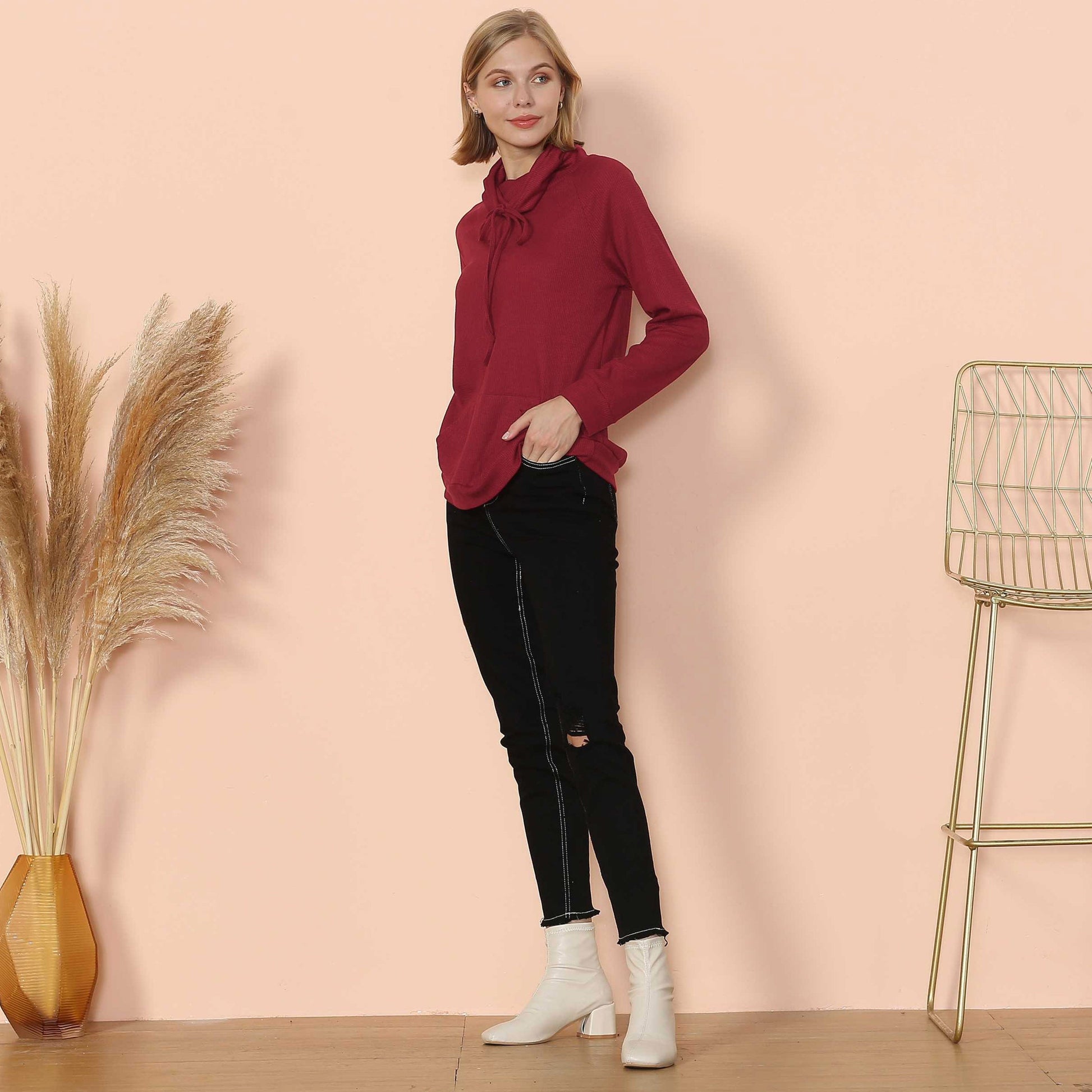 The Anna-Kaci light long sleeve pullover is detailed with a cute cowl neck on a waffle knit textured top that's warm and soft to the touch. Features tied strings, front pocket pouch, and a relaxed cozy fit. Easily layer it over your top and jeans for an easy fall and winter look.