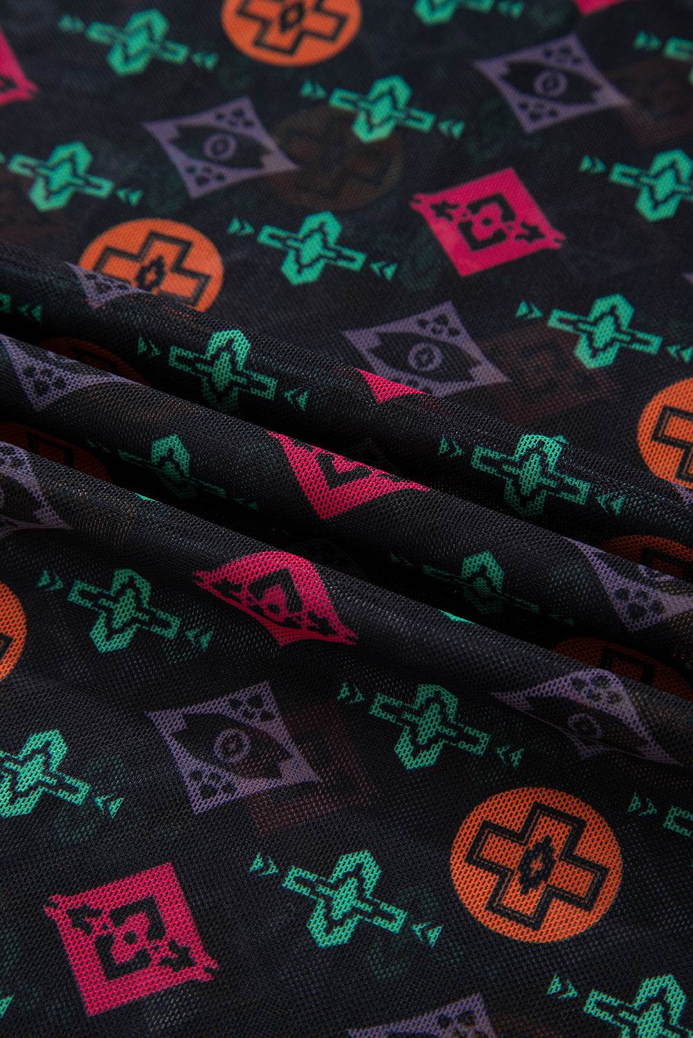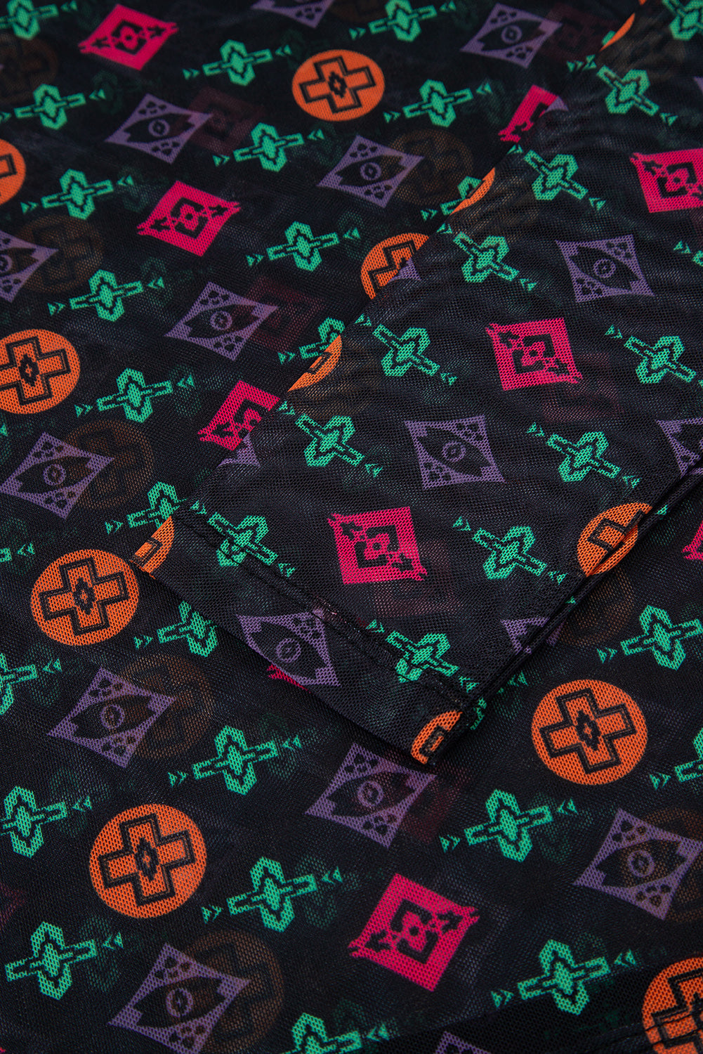 Step out with flair in this top. The vibrant print brings a fun, trendy vibe, while the mesh panels add a cheeky touch of allure. Its slim fit hugs your curves perfectly, blending a cool Western spirit with modern style for a look that's both bold and playful. Polyester/Spandex