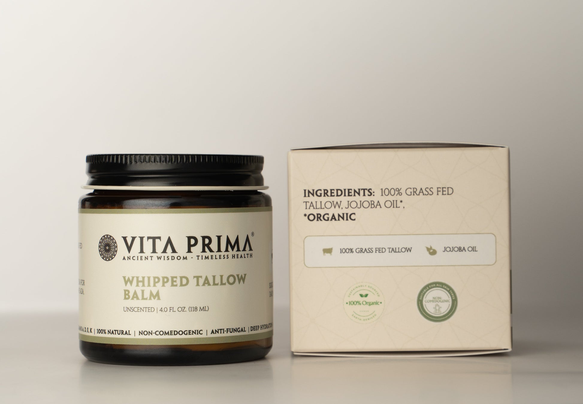 Whipped Tallow Balm is a luxurious, all-natural blend of grass-fed and finished tallow, organic wildflower honey, jojoba oil, and tea tree oil. Packed with essential vitamins (A, D, E, K, B1, B3, B5, B6, B12, and C), it nourishes your skin deeply, promoting hydration, a youthful glow, and improved elasticity through enhanced collagen production.