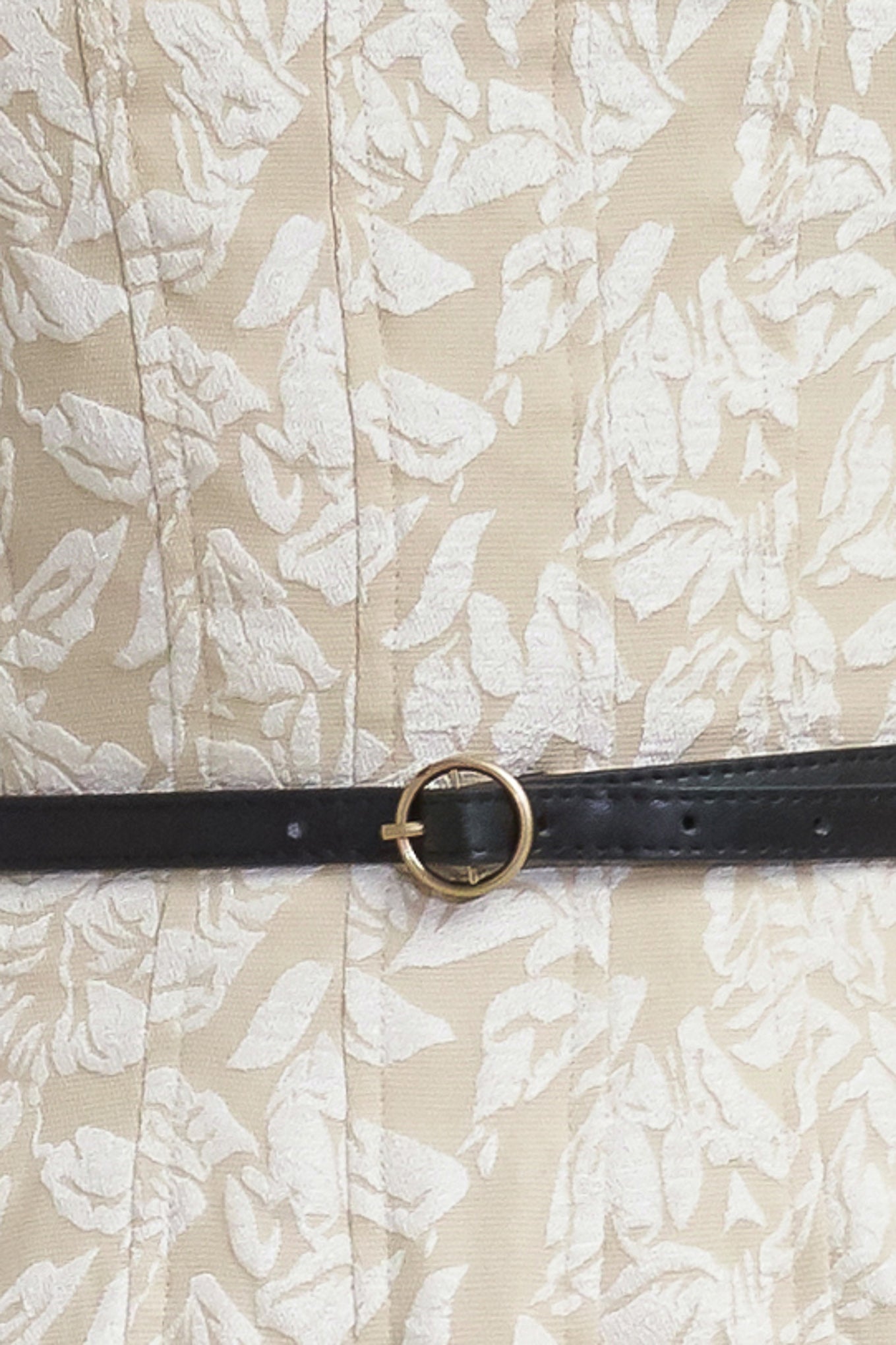 A textured woven midi dress featuring strapless, contrasting belt, pleated full skirt and back zipper closure