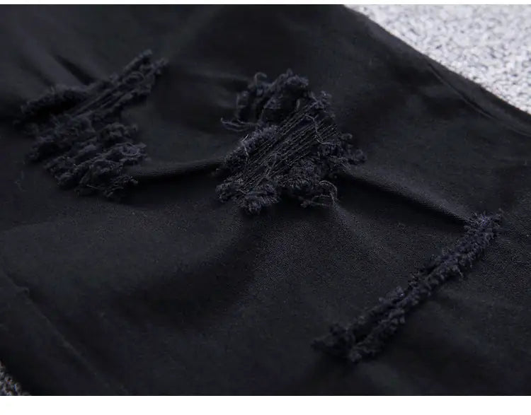 Step up your fashion game with these trendy zippered holes elastic denim pants. Their unique design and comfortable fit make them a must-have addition to your closet. Perfect for any casual outing, these pants will ensure you stand out in style.